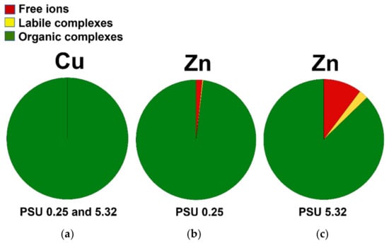 Consistent with the literature findings (see introduction), the modelling results show Cu, at both salinity conditions, to be completely bound in non-available organic complexes, regardless of whether the origin of DOC was either humic or fulvic, Figure 3. No free Cu ions or labile complexes are predicted stable at these conditions [53]. Similar results were obtained for Zn with the exception of small fractions of free Zn ions (2–13%) and some labile complexes (3–4% in the case for the highest water salinity conditions). The speciation modelling hence indicates a low and very low bioavailable fraction for Zn and Cu (<17% for Zn, i.e., <0.42 µg/L; <0.1% for Cu, i.e., <0.15 µg/L) at prevailing conditions in the Strömmen-Saltsjön water body (mean total dissolved values in Table 2).