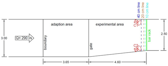 Plan view of the experimental channel with upstream boundary and gate between adaption and experimental area, camera position (C1 and C2) in red, bar rack within the flume (green), 40, 20 and 10 cm lines at the channel bed (blue, orange, cyan, respectively).