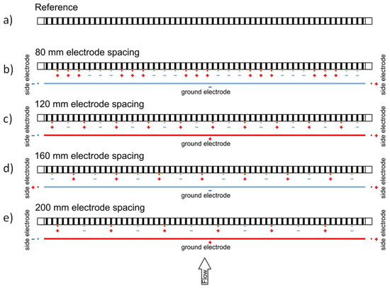 Location and polarization of the electrodes attached to the bar rack and additional electrodes at flume walls and channel bed for reference and electrified setups in layout view, flow from bottom to top. (a) se = Reference, (b) se = 80 mm, (c) se = 120 mm, (d) se = 160 mm, (e) se = 200 mm electrode distance.
