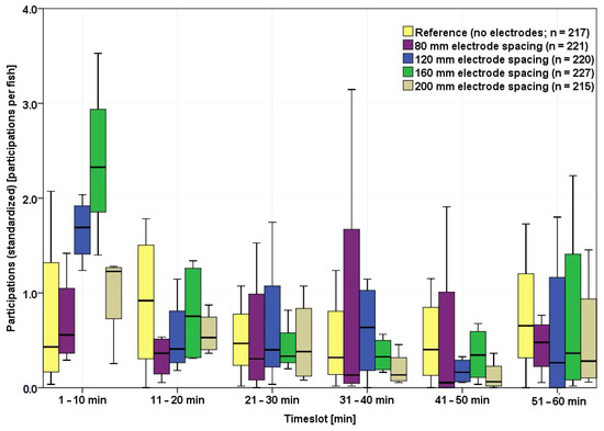 The recorded activity of the fish during almost all experiments was consistently high (Section 3.2). A higher number of passages over the 40 cm marker line (participations) was recorded in electrified experiments with se = 120 mm and 160 mm during the first minutes of the experiment (Figure 3). This was not recorded in reference trials or with se = 80 mm and 200 mm. Other influencing factors such as water temperature, date or time of day were not connected to the activity patterns of fish. In general, fish activity slightly decreased after opening the gate at the start of the experimental phase, which may be due to initial exploration behavior. Hence, it can be assumed that the increased number of approaches, and especially rack passages, in the first minutes only occurs in experiments and can not be transferred to sites in the field.