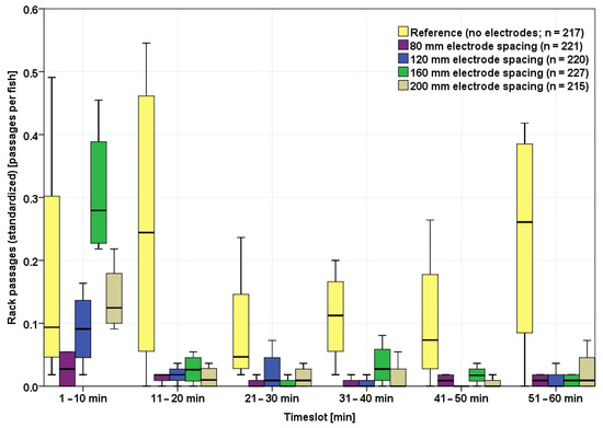 Standardized rack passages (recorded rack passages/stocked individuals in experiment) during time slots of 10 min for all five setups (each N = 4). Boxplots include representative statistic measures: minimum, first quartile, median, third quartile and maximum. Number of participating individuals per setup and four trials (N = 4) is denoted as n.