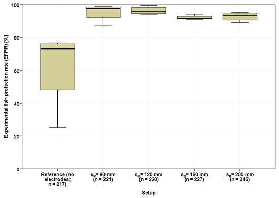 The EFPR during reference experiments averaged 62.0% (±24.8% SD, Table 2) and was significantly lower than the EFPR in electrified setups, which had an average EFPR of 92.1% (±1.4% SD) to 96.4% (±2.4% SD) (2 = 337.8, p = , V = 0.281). In detail, pairwise tests showed that the EFPR of the unelectrified barrier was on average 30.1–33.4% lower than for each of the electrified setups. These results are statistically significant in all four comparisons, which exhibit a moderate effect size of 0.23–0.33 (Table 3). Comparisons between the electrified setups reveal a slightly decreasing fish-protection rate between the first two (se = 80 mm and se = 120 mm) and the last two (se = 160 mm and se = 200 mm) setups (Figure 5). Although all of these four combinations are statistically significant, their effect sizes are rather low (Table 3). Pairwise tests of the first two (se = 80 mm vs. se = 120 mm) and last two electrical setups (se = 160 mm vs. se = 200 mm) do not show significant differences in their fish-protection rate (Table 3).