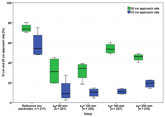 Approach rates [%] based on the number of participations in all setups (each N = 4). Boxplots include representative statistic measures: minimum, first quartile, median, third quartile and maximum. Number of participating individuals per setup and four trials (N = 4) is denoted as n.