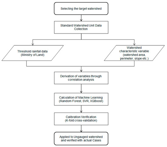 Much of the literature cited above only used a single hydrological model. However, in this study, two models were coupled and used to calculate the marginal rainfall [8] and it is considered an advantage of this paper to apply the results to machine learning. Figure 1 shows the flow chart of this study. It was analyzed through machine learning using threshold rainfall and topographic factors of standard watershed units. The threshold rainfall was used as a dependent variable, and the topographic factor of the standard watershed unit was designated as an independent variable. In addition, the model with the smallest error was selected using error performance analysis to calculate the threshold rainfall in the ungauged basin where hydrological analysis was difficult. The ungauged basin means a coastal area where it is difficult to calculate the threshold rainfall.