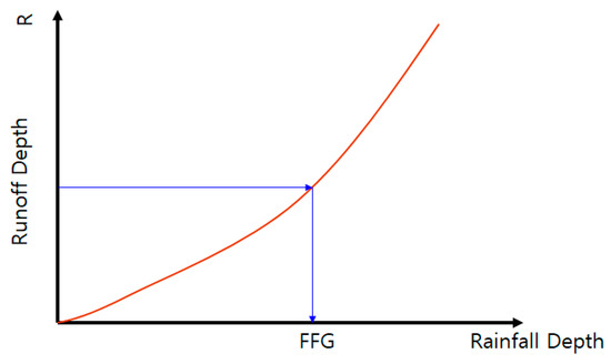 In a rainfall-runoff model, rainfall and soil moisture constitute the inputs. However, the opposite is true with the flash flood threshold; calculation of flash flood threshold requires current soil moisture and required flow as inputs. As such, the equation on upper stream water and small-sized rivers is converted for FFG using the repetitive calculation method, as shown in Figure 2, to calculate the rainfall that causes threshold runoff. The FFG is the rainfall corresponding to the threshold runoff in the relationship of the rainfall and runoff curve. If there is no impervious area, the relationship between R and FFG can be expressed in Figure 2 and Equation (2). means the threshold runoff (mm), means the flash flow guidance (mm), and means the fall-runoff process. Moreover, means rainfall intensity.