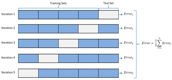 Ideally, these errors need to be tested by applying them to actual ungauged watersheds. However, due to data and time constraint, the prediction models were validated using five-fold cross validation. K-fold cross validation is a model assessment method that uses a part of the overall data as a validation set. It ensures that all data are used as dataset at least once. Figure 5 shows dividing the data into five datasets and validating the models with a different dataset each time. An average cross-validation uses five datasets. This study selects the optimal parameters following cross validation to calculate threshold rainfalls.