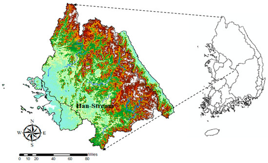 This study chose the Han River watershed as its target, as the area includes the highest number of standard watersheds according to the water resource unit map. 290 of Korea’s 850 standard watersheds are included in the Han River watershed. 237 of the 290 watersheds are inland, and the other 53 are coastal watersheds, as shown in Figure 6.