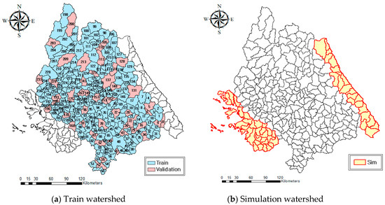 The (a) section of Figure 7 shows the learning watersheds; 80% of the learning watersheds were used for machine learning, and the other 20% were used for validation. High-performing models were selected with (a), and predictions were performed for the watersheds highlighted yellow in (b). The data set of the basin used for machine learning was randomly selected and proceeded.