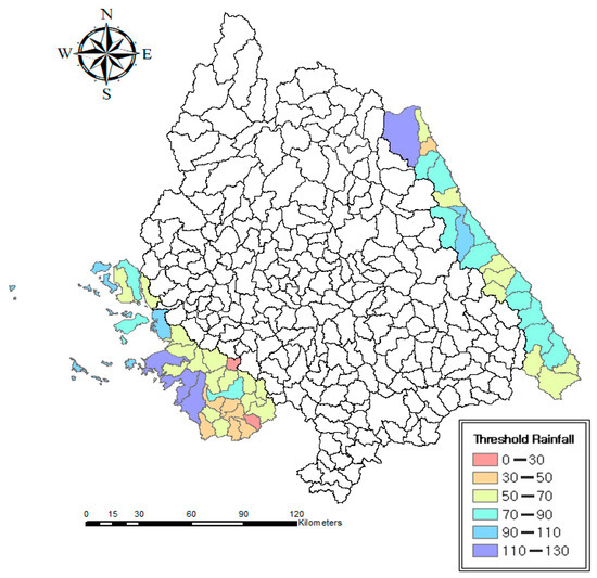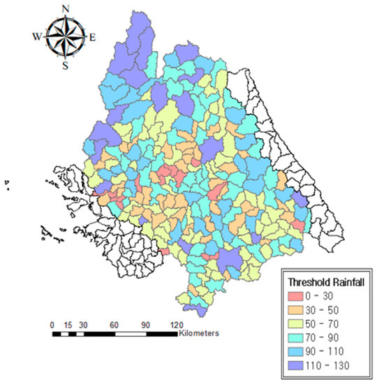 This study used the threshold rainfalls calculated using the MOLIT method [8,15,41] as dependent variables. Figure 8 shows the calculated threshold rainfalls on the map.