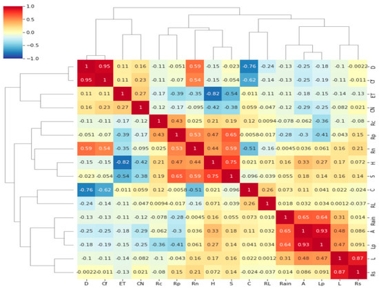 A correlation analysis was performed to select statistically correlated independent variables, as independent variables not correlated to dependent variables may lower the prediction performance. The correlation analysis was performed as shown in Figure 9. Given the fact that the threshold runoffs required for calculating threshold rainfalls were calculated from peak flood volumes and overflowing runoffs, the following variables were determined to be significantly correlated: drainage area, river length, drainage perimeter, relative relief, and river length ratio. Among those factors, river length, river length ratio, relative relief, and drainage perimeter were determined to be more highly correlated with the independent variables. The correlation coefficient was 0.65 for threshold rainfall and drainage area, 0.64 for drainage perimeter, and 0.31 for river length. As such, drainage area, drainage perimeter, and river length were finally selected as independent variables. In most data analyses, principal component analysis (PCA) should be used to reduce initial independent variables [42], but in this study, a principal component analysis was omitted because the amount of data for each independent variable was not large.