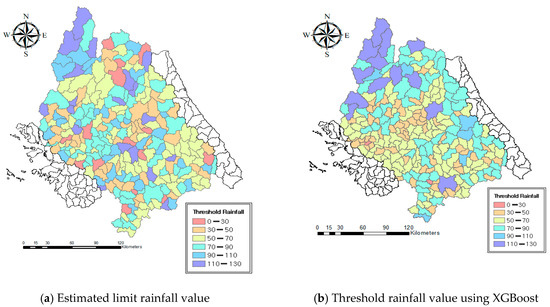 Figure 10 compares the existing threshold rainfalls with those calculated using XGBoost. Most threshold rainfalls are distributed between 40 and 60 mm and between 60 and 80 mm and are close to actual observations.