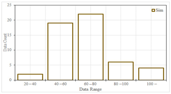 This study used XGBoost, which produced good results in error performance assessment, to calculate the threshold rainfalls of ungauged watersheds. Figure 12 shows the distribution of the threshold rainfalls calculated for the ungauged basins. The majority of watersheds show threshold rainfalls between 40 mm and 80 mm. Figure 13 is a map showing the threshold rainfalls of the ungauged basins other than the those in the inland areas.
