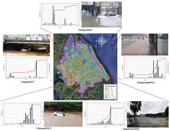 As for previous literature on threshold rainfall calculation, ref [8] developed a flash food monitoring and prediction (F2MAP) model to calculate the flash flood-threshold runoff from rainfall. Ref [9] analyzed the relationship between flash flood index and runoff number characteristics to develop an equation between the two. Ref [10] proposed a threshold runoff calculation method using the flash flood guidance (FFG) model, which is more suitable for Korea rather than those used in the United States. The researchers presented the method as a way to acquire basic data for a flash flood forecast system. Ref [11] analyzed runoff in Jeju using the SWAT-K model that combines DEM, landcover, soil map methods, and developed a threshold runoff simulation method (TRSM) specifically for the island. Ref [12] used ArcGIS and HEC-GEOHMS to divide the Nakdonggang River watershed into 2268 sectors, drew rainfall-peak flow curves for different initial loss scenarios and antecedent moisture conditions, and calculated the threshold rainfalls. Ref [13] estimated threshold rainfalls for different durations using events with damage caused by past rainfall in urban areas and others without such damage. Ref [14] stressed the need for impact forecast and estimated threshold rainfalls using the SWMM model. Ref [7] also linked the grid base inundation analysis model (GIAM) for grid-based inundation analysis. Using the Huff distribution [14], the researcher converted the data into time-series rainfall data to simulate inundation depths, and inversely estimated the threshold rainfall based on the inundation depths. Ref [15] collected data on rainfall and typhoon damage over the last five years where inundation was caused, analyzed the relationship between rainfall and the damages, and developed an equation for threshold rainfall (). As can be seen from the literature cited above, Korean studies on threshold rainfall mostly used hydrological models. Few researchers studied threshold rainfall by considering hydrological characteristics.