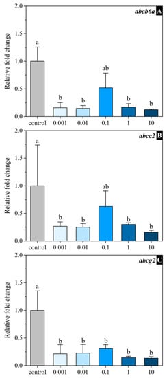 - Jeong, C.-B.; Kim, H.-S.; Kang, H.-M.; Lee, J.-S. ATP-binding cassette (ABC) proteins in aquatic invertebrates: Evolutionary significance and application in marine ecotoxicology. Aquat. Toxicol. 2017, 185, 29–39. [Google Scholar] [CrossRef]