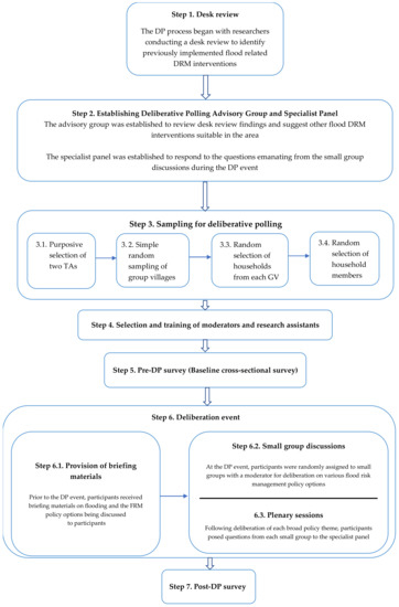 This was a mixed methods study with both quantitative and qualitative data collected, analysed and presented. A DP-based repeat cross-sectional survey, with pre-deliberative and a post-deliberative event assessment, was conducted (Figure 1). In between the surveys, a facilitated deliberative event was conducted at a local primary school to collect qualitative information on opinions held by participants on FRM policies. The conduct of the deliberative event in between the surveys allowed for assessment of the impact of the deliberations among participants and with a panel of specialists on their support for various FRM policies. Data collection methods followed a seven-step process previously published elsewhere [30] and described below. The study was approved by the University of Pretoria’s Faculty of Health Research Ethics Committee in South Africa and the National Committee on Research in the Social Sciences and Humanities (https://www.ncst.mw/national-committee-on-research-in-the-social-sciences-and-humanities/; accessed on 15 September 2018) in Malawi.