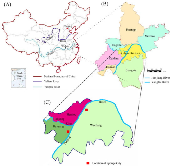 The study area; (A) the location of Wuhan City; (B) Wuhan about Yangtze River; (C) central districts in Wuhan about the pilot sites of Sponge City (source: Shan Zheng).