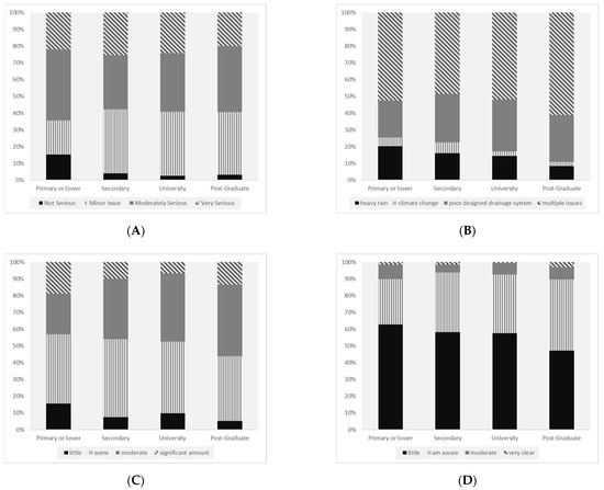 Cross-analyses between education level and survey questions: (A) the awareness of the severity of flood in Wuhan; (B) the perception of the causes of flood; (C) the perception of governmental efforts in flood control; (D) the awareness of Sponge City projects.