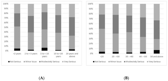 The effect of residential time (A) and age (B) on the perception of the severity of flood in Wuhan.