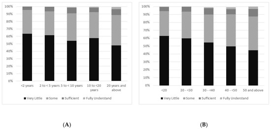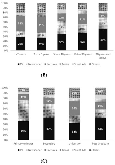 Age and residential time often affected the pattern of how the interviewees answered the same questions (Table 3). The respondents who lived in Wuhan longer or are older tend to consider flood a moderate and significant issue of the city (Figure 3A, Chi = 49.46, df = 12 and p < 0.001, and Figure 3B, Chi = 45.01, df = 12, p < 0.001). Although the SCP was not announced till 2014, allowing most of the respondents equal opportunities to be exposed to the news, the level of awareness of the program was still increased in the groups of longer residential time or the groups of elder ages (Figure 4A, Chi = 45.20, df = 12 and p < 0.001; Figure 4B, Chi = 37.96, df = 12 and p < 0.001). The levels of environmental awareness among the participants seemed to increase when life experience accumulated or attachment to the surroundings potentially grew. We later elaborate on the implication of this in the use of media for broadcasting the information related to Sponge City (Section 5.6).