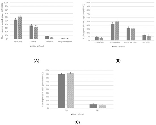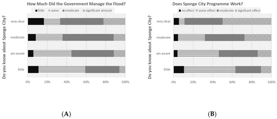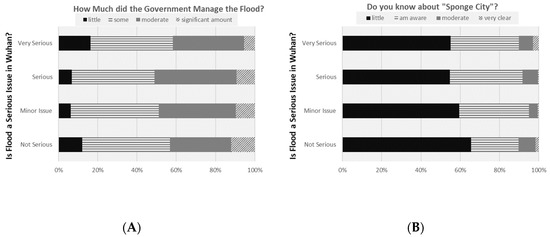 The frequency analysis results from each subgroup (Figure 2A–D) indicated that the relative proportions among answer options are not completely altered by the education levels; the absolute values of percentages between the same answer options in each subgroup, however, varied widely enough to cause statistical significance. For example, on the severity of the flood (Figure 2A), the proportions of the respondents under each subgroup believing that the flood is “not serious” are the lowest among the four answer options, but the absolute percentage is distinctively higher in the group with only primary education (15 ± 5%, other groups lower than 5% with confidence interval smaller than 3%); more than half of the respondents in each subgroup considered the flooding to be a moderate or serious issue.