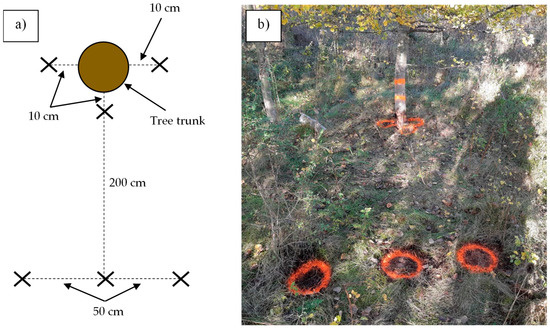 (a) Diagram of MDI measurement location in proximity to the sample tree. Black crosses (X) indicate MDI measurement location. (b) MDI measurement locations represented at the 2008 sample site.