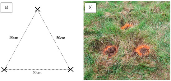 The 10 cm datums were identified, and a line was measured from the base of the tree in the direction of least obstruction (i.e., no other trees, undergrowth, or shrubbery intruding the area) to mark the location of the 200 cm measurement locations; 50 cm was measured either side of the line to identify replica locations. Replication could not take place in the exact same location as the initial infiltration measurement, as any measurements would be skewed due to previous saturation of the soil; so, 50 cm was chosen to avoid lateral seepage (leading to the overestimation of infiltration values) [54,55,56]. The control site measurements were collected in a triangular pattern, with each replication being 50 cm from the last to avoid lateral seepage (Figure 3a,b).