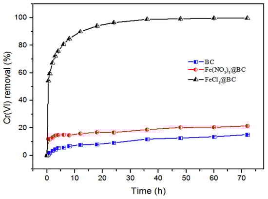 The quantity of Cr(VI) eliminated by BC, FeCl3@BC, and Fe(NO3)3@BC.