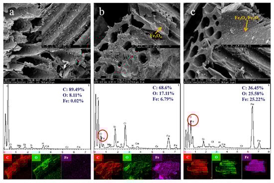 SEM-EDS analyses of BC (a), FeCl3@BC (b), and Fe(NO3)3@BC (c).
