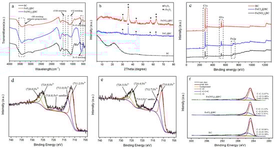 The comparative spectra of BC of FeCl3@BC and Fe(NO3)3@BC as revealed by FTIR (a), XRD (b) and XPS (c). XPS Fe2p spectra of FeCl3@BC (d) and XPS Fe 2p spectra of Fe(NO3)3@BC (e), XPS C1s spectra of BC, of FeCl3@BC and Fe(NO3)3@BC (f).