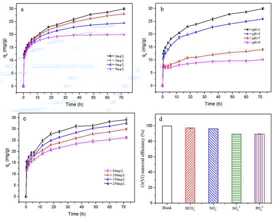 Moreover, Figure 4c illustrated the effect of Cr(VI) initial amount (60 to 250 mg/L range) on the Cr(VI) removal. It was observed that the adsorption capacity of Cr(VI) decreases as the initial concentration of Cr (VI) increases. It might be owing to the reason that with increase in Cr(VI) initial concentration, the interaction probability of Cr(VI) with active surface sites of FeCl3@BC and the driving force of Cr(VI) from the solution to the surface of the adsorbent increase [22]. Further, in groundwater environment, Cr(VI) often coexists with NO3−, SO42−, HCO3−, and PO43− anions, so these ions often compete for adsorption sites with Cr(VI), and thus affect Cr(VI) elimination by FeCl3@BC (Figure 4d). Among coexisting anions, SO42− and PO43− have the greatest influence on the Cr(VI) deletion. HCO3−and NO3− have no significant effect on Cr(VI) removal, which might be associated to the strong adsorption of SO42−and PO43− by FeCl3@BC. This indicated that electrostatic adsorption has a noteworthy role in the elimination of Cr(VI) by FeCl3@BC. Further, PO43− may also react with iron oxides, forming iron-phosphorus-complexed on FeCl3@BC surface, thus blocking adsorption sites, and influencing the removal of Cr(VI) [26].