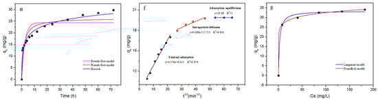 The pseudo-first-order (Equation (1)), pseudo-second-order (Equation (2)), Elovich equation (Equation (3)), and intra-particle diffusion model (Equation (4)) were employed to reveal the rate control steps of material transfer and physicochemical reaction in the adsorption process, as follows: