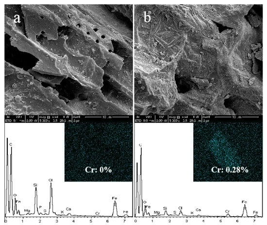 The SEM and EDS results of FeCl3@BC before and after the reaction with Cr(VI) are shown in Figure 5. It can be found that the surface of FeCl3@BC after the reaction becomes rough and a large amount of precipitation is observed. In addition, the atomic percent results of Cr provided by EDS have exposed that it is inferred that Cr(VI) and Cr(III) are adsorbed or precipitated on the surface of FeCl3@BC. The XRD spectrum of FeCl3@BC revealed a new peak of FeCr2O4 (Figure S6). This indicated that the reduced Cr(III) can be converted into Fe-O-Cr precipitation. It was also previously reported that stable CrxFe1−x(OH)3 crystals might be formed by reaction of Cr(III) with Fe3+. However, the characteristic peak of CrxFe1−x(OH)3 was not observed in the XRD spectrum of FeCl3@BC after the reaction, so the generation of amorphous CrxFe1−x(OH)3 was speculated in this reaction [25,26].