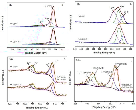 The O1s peaks of FeCl3@BC before the reaction were O-Fe at 530.5 eV, C-O at 531.8 eV, and C=O at 533.4 eV in Figure 6b [64,65,66]. While, after the reaction, the binding energy of FeCl3@BC was slightly shifted to the low-energy region, thus indicating that the local binding environment has changed owing to Cr(VI) adsorption. In addition, Fe2p peak of FeCl3@BC has also shown changes after the reaction in Figure 6c, demonstrating that Fe2+ on the surface might be responsible for the reduction of Cr(VI) to Cr(III) [67]. Further, the Cr2p peak was considered to show the adsorption morphology of Cr(VI) on biochar in Figure 6d. After the reaction, the peaks of FeCl3@BC at 579.2 and 588.2 eV corresponded to Cr(VI)(Cr2p3/2) and Cr(VI)(Cr2p1/2), while the peaks at 577.2 and 586.9 eV corresponded to Cr(III)(Cr2p3/2) and Cr(III)(Cr2p1/2) [12]. The Cr(VI) content was 40.2%, and the Cr(III) content was 59.8%. Thus, these findings demonstrated that the elimination of Cr(VI) is mainly its reduction to Cr(III).
