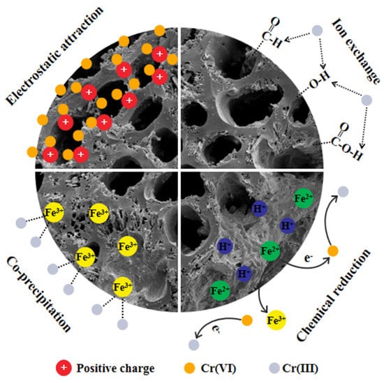 Biochar is a carbon-rich material fabricated via pyrolysis and carbonization of biomass. It is a good environment-friendly material due to its low production cost and no secondary pollution. Meanwhile, it is a porous medium with huge specific surface area and abundant functional groups, which can be used for the removal of heavy metal pollutants. Cr(VI) is a redox-sensitive heavy metal pollutant, and biochar can remove it through adsorption and reduction [7,8,9,10,11]. It is reported that biochar mainly removes Cr(VI) through electrostatic adsorption, redox, co-precipitation, ion exchange, and other mechanisms [12]. However, surface of original biochar is usually negatively charged, while Cr(VI) usually occurs as an anion, which limits its adsorption ability by biochar [13]. In addition, the limited redox sites on the surface of pristine biochar also limited its ability to reduce Cr(VI). Therefore, metal oxides are usually introduced into the surface of biochar by modification techniques to increase the active site and zero charge point (pHpzc), thus enhancing the adsorption and reduction capacity of Cr(VI) [14,15,16].