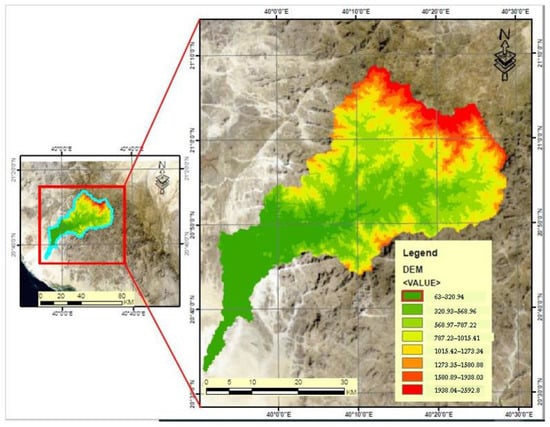 The basin of the Yalamlam Wadi occupies a wide area of some 1665 km2. The basin boundary, situated in the downstream area, is extended to include virtually all of the lower flat area. From the high altitudes of the Hijaz Mountains, near Taif, Wadi Yalamlam starts from the Al Shafa region. This has an annual average rainfall of 140 mm. The wadi has various altitudes, ranging widely from 2600 to 25 m. A general location map and a digital elevation model (DEM) of Wadi Yalamlam are shown in Figure 1. The higher and lower parts of the basin are dominated by incisive natural vegetation. Quaternary deposits and sand dunes, on the other hand, followed by tiny dispersed fragments, greatly alter the granitoid and metamorphosed basaltic slopes, the constituents of the lower part of the wadi [28].