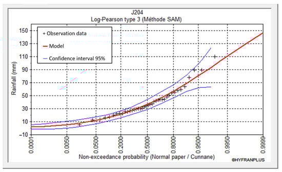 Log-Pearson type 3 fit of maximum daily rainfall for J204 station.