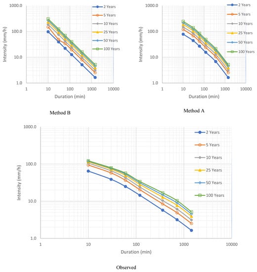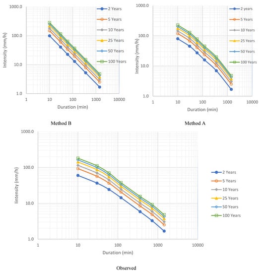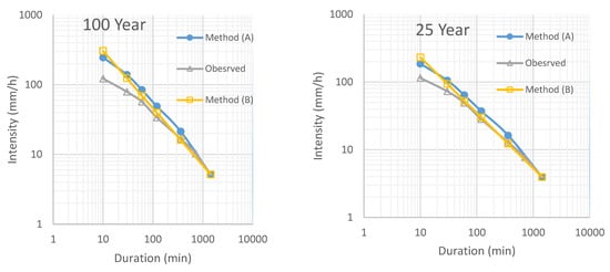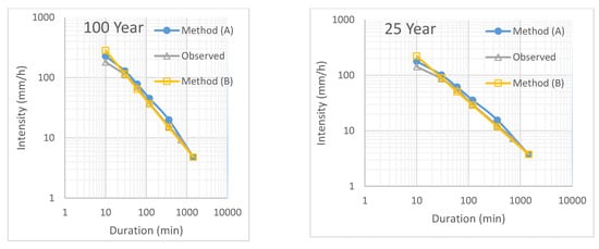 For comparison, the rainfall intensity was plotted with duration at 100-year and 25-year return periods for all methods (A, B, and observed), as shown in Figure 7 and Figure 8.