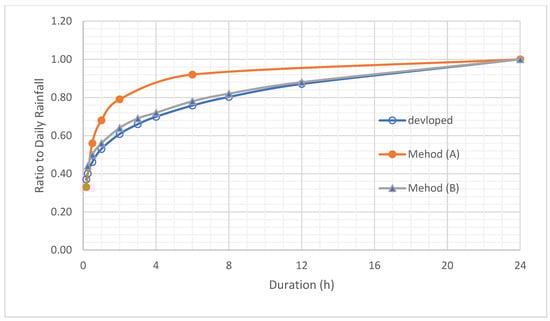 Method (A) was applied in the southwest of Saudi Arabia, which is the same region for the current study area. The hydrological characteristics for that region are more or less the same. However, due to the limited data used, which was only six years (1983–1988), as well as this method was presented more than three decades, it did not make up for the climate changes which had happened during the preceding 30 years of the study; therefore, significant variations between the current study and Method (A) are to be expected. Method (B) was developed based on daily rainfall measurements and some short durations spanning 30 years (1963–1994), and this is considered good record. Although their study area was far from the current study area, the results of that method (B) are closer to the current results.