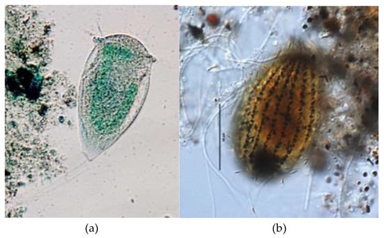 - Foissner, W.; Berger, H. A user-friendly guide to the ciliates (Protozoa, Ciliophora) commonly used by hydrobiologists as bioindicators in rivers, lakes, and waste waters, with notes on their ecology. Freshw. Biol. 1996, 35, 375–482. [Google Scholar] [CrossRef]