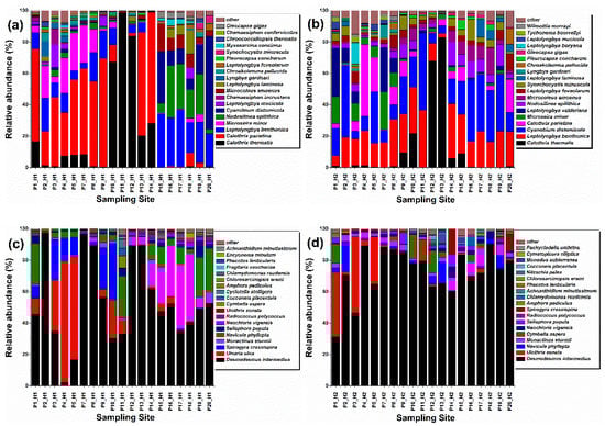 Periphytic algal relative abundance ((a) H1 cyanobacteria; (b) H2 cyanobacteria; (c) H1 eukaryotic algae; (d) H2 eukaryotic algae).