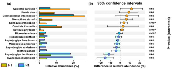In the laboratory, periphytic algal DNA was extracted with an E.Z.N.A.® Soil/Stool DNA Kit (Omega Biotek, Norcross, GA, USA) according to the manufacturer’s instructions. DNA concentrations and quality levels were measured with an ND-2000 spectrophotometer (NanoDrop Technologies, Wilmington, DE, USA). PCRs were performed in triplicate in a 20 μL mixture containing 4 μL of 5 × FastPfu Buffer, 2 μL of 2.5 mM dNTPs, 0.8 μL of each primer (5 μM), 0.4 μL of FastPfu Polymerase, 0.2 μL of bovine serum albumin (BSA) and 10 ng of template DNA. The PCR parameter was 95 °C for 3 min, followed by 25 cycles at 95 °C for 30 s, 55 °C for 30 s, 72 °C for 45 s and a final extension at 72 °C for 10 min. Cyanobacteria V3-V4 hypervariable region of the 16S rRNA were amplified by PCR using primers 338F (5′-ACTCCTACGGGAGGCAGCA-3′) and 806R (5′-GGACTACHVGGGTWTCTAAT-3′), and eukaryotic algae V4 hypervariable region of the 18S rRNA were amplified by PCR using primers 3NDF (5′-GGCAAGTCTGGTGCCAG-3′) and V4_euk_R2 (5′-ACGGTATCT(AG)ATC(AG)TCTTCG-3′), where the barcode was an eight-base sequence unique to each sample. Amplicons were extracted from 2% agarose gels and purified using the AxyPrep DNA Gel Extraction Kit (Axygen Biosciences, Union City, CA, USA) according to the manufacturer’s instructions, and quantified using QuantiFluor™-ST (Promega, Madison, WI, USA). Paired-end sequencing for PCR products was conducted on Illumina MiSeq (Illumina, San Diego, CA, USA) as previously described []. The overlapping paired-end reads were joined with FLASH using the default setting []. The merged sequences were subsequently quality filtered and analyzed with QIIME 1.9.1 []. Chimera sequences were removed using USEARCH 7.0 []. The remaining sequences were clustered into operational taxonomic units (OTUs, 97% similarity level) using UPARSE 7.0 []. The representative sequence of each OTU was taxonomically annotated based on the SILVA 128 database. After taxonomies had been assigned, OTUs that were affiliated with archaea, chloroplasts, unclassified (not affiliated with bacteria), and singleton OTUs were removed from the dataset. In H1, 151,259 reads of cyanobacteria were produced, with an average of 7961 reads per sample, and 131 species of cyanobacteria were identified. In H2, 121,087 reads of cyanobacteria were produced, with an average of 6373 reads per sample, and 140 species of cyanobacteria were identified. In H1, 148,390 reads of eukaryotic algae were produced, with an average of 7810 reads per sample, and 82 species of eukaryotic algae were identified. In H2, 109,098 reads of eukaryotic algae were produced, with an average of 5742 reads per sample, and 81 species of eukaryotic algae were identified.