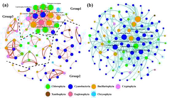 Co-occurrence network of the periphytic algal communities in H1 and H2 (a) positive correlation network (b) negative correlation network. Each node represents an individual species, and the species belonging to the same phylum are displayed in the same color. The sizes of nodes reflected their connecting degrees. The higher the degree, the more connections there were between this species and other neighboring species. Each edge between two nodes represents positive or negative interactions between the two species. A connection stands for a significant (|r| > 0.7, p < 0.05).