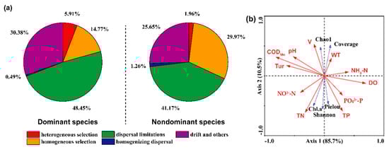 Stochastic processes include weak selection, dispersal limitation, diversification, and drift, and are not the consequence of environmentally determined fitness []. Dispersal limitation signifies the circumstance that low dispersal rates could increase community richness variations [,]. When the environmental conditions were suitable for the coexistence of more species, the community suffered less selection pressure, and the assembly was mainly governed by stochastic processes [,]. The results of this study showed that the variation in total nitrogen and total phosphorus promoted more stochastic processes, the periphytic algal community assembly was mainly affected by dispersal limitation, and community richness increased, suggesting that the MRP provided a relatively suitable growth environment for periphytic algae, and a low dispersal rate increased the community richness.