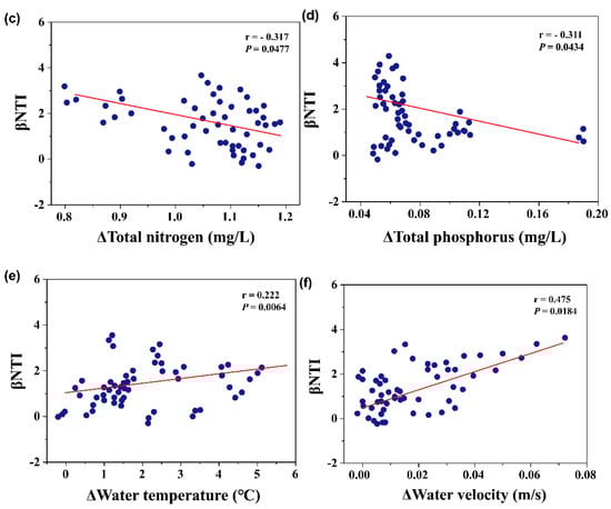 Based on RDA, a subset of environmental factors (total nitrogen, total phosphorus, water temperature and water velocity) was selected to identify the relationship between βNTI and the variation in environmental factors (Figure 5b and Supplementary Figure S4). βNTI was significantly negatively correlated with the variation in total nitrogen and total phosphorus (Figure 5c,d), indicating that the variation in total nitrogen and total phosphorus led to a shift from heterogeneous selection (βNTI > 1.96) to stochastic processes (−1.96 < βNTI < 1.96). βNTI was significantly positively correlated with variations in water temperature and water velocity (Figure 5e,f), indicating that variations in water temperature and water velocity led to a shift from stochastic processes (−1.96 < βNTI < 1.96) to heterogeneous selection (βNTI > 1.96).