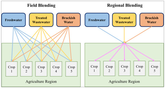 Schematic illustration of the field and regional blending scenarios in an agricultural region with five crops that can be irrigated by three water sources with different salinity levels: freshwater, treated wastewater, and brackish water.