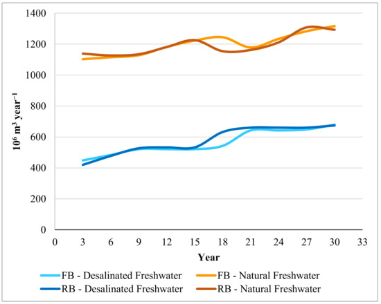 Trajectories of freshwater types supplied from desalination plants and natural sources throughout the simulated 30-year period under the FB and RB scenarios.