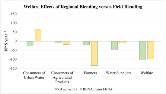 The overall welfare change is nearly USD 100 million a year—about 5% of the total variable water supply costs. On average, the deadweight loss amounts to USD 0.08 per cubic meter of irrigation water. Most of the burden associated with imposing RB falls on the water suppliers; as it will be shown later, this loss is due to lower efficiency water prices, which stem from the higher salinity of the irrigation water and consequently, its lower VMP. With no adaptation (RBNA minus FBNA), most of the welfare loss caused by RB versus FB is experienced by the farming sector, whereas the consumers of urban water benefit from this situation. Thus, by reallocating agricultural land and irrigation water across crops, farmers manage to reduce their welfare loss by 85% (see Section 3.3).