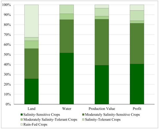 Shares of the groups of salinity-tolerant/sensitive crops and rain-fed crops in the state-wide total agricultural land, irrigation water use, production value, and profit at the calibration stage.