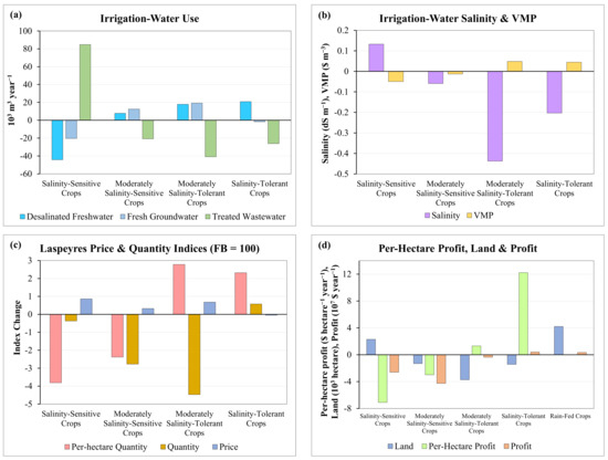 Figure 6c presents changes in the Laspeyres quantity and price indices (FB = 100), and Figure 6d reports the respective changes in land allocation and profits. The per hectare quantity index (computed by holding both the land allocated to the crops and their prices at their values under the FB scenario fixed) of the salinity-sensitive crops exhibits the largest reduction; however, because the land allocated to these crops increases (Figure 6d), the overall quantity of the salinity-sensitive crops’ production declines only slightly. In turn, the output prices of these crops increase. Increasing the share of the salinity-sensitive crops in the total agricultural land entails less water for all of the other irrigated crops, and therefore, their share of the land shrinks, and they are replaced by rain-fed crops. Similarly, the combinations of changes in land and the per hectare productivity of the other groups dictate the overall quantity and price changes (Figure 6c), and, in turn, the per hectare profitability and total profit (Figure 6d).