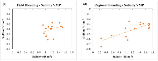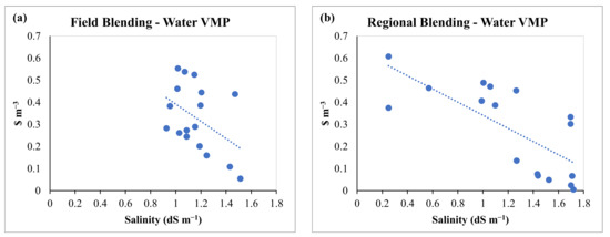Regional VMPs of irrigation water and its salinity plotted against regional average salinities under the field blending and regional blending scenarios.